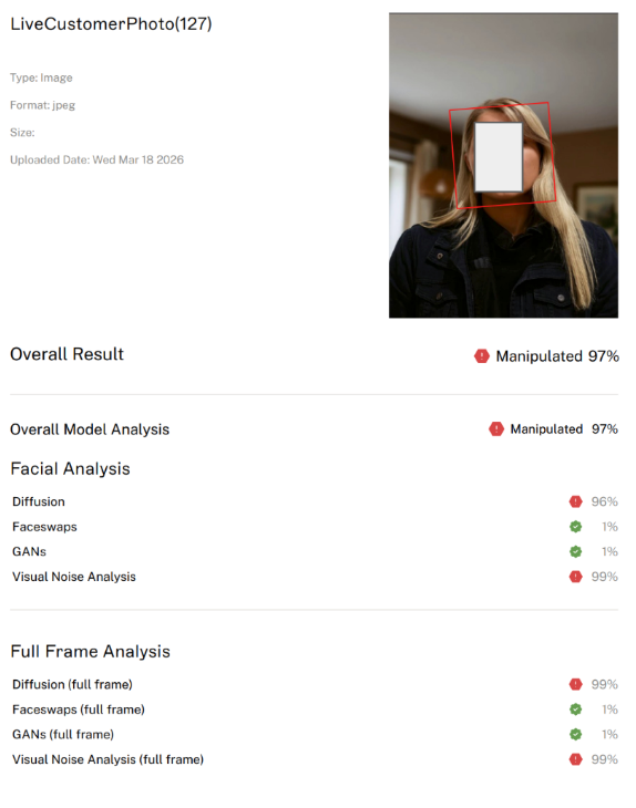 "The deepfake selfie was generated using a diffusion-based AI model with 99% confidence. It was blocked before any accounts were compromised."